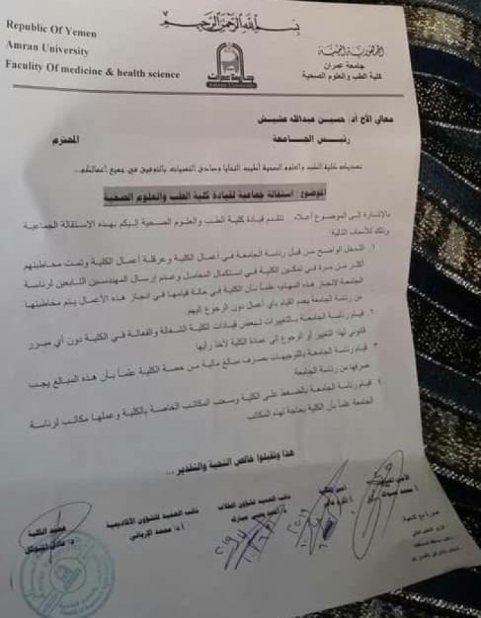 عمادة كلية الطب بعمران تتقدم باستقالة جماعية بسبب الحوثي (وثيقة)