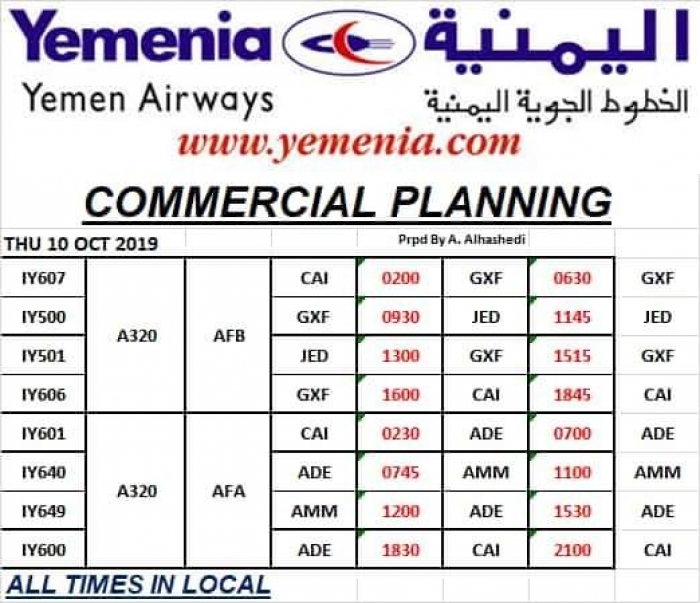 ينشر "المشهد العربي" مواعيد إقلاع رحلات طيران اليمنية غداً الخميس الموافق 10 أكتوبر 2019.