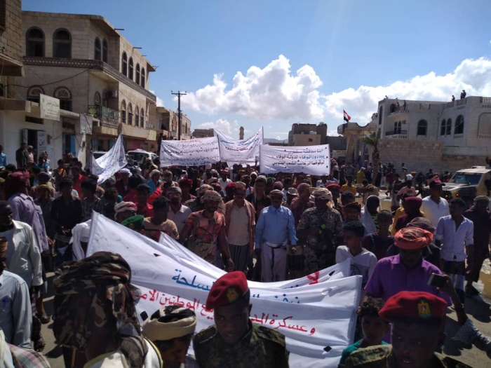 و رفع المشاركون في المسيرة لافتات ترفض عسكرة الجزيرة من قبل مليشيات حزب الإصلاح الإخواني والهادفة إلى جر الجزيرة إلى صراع داخلي.
