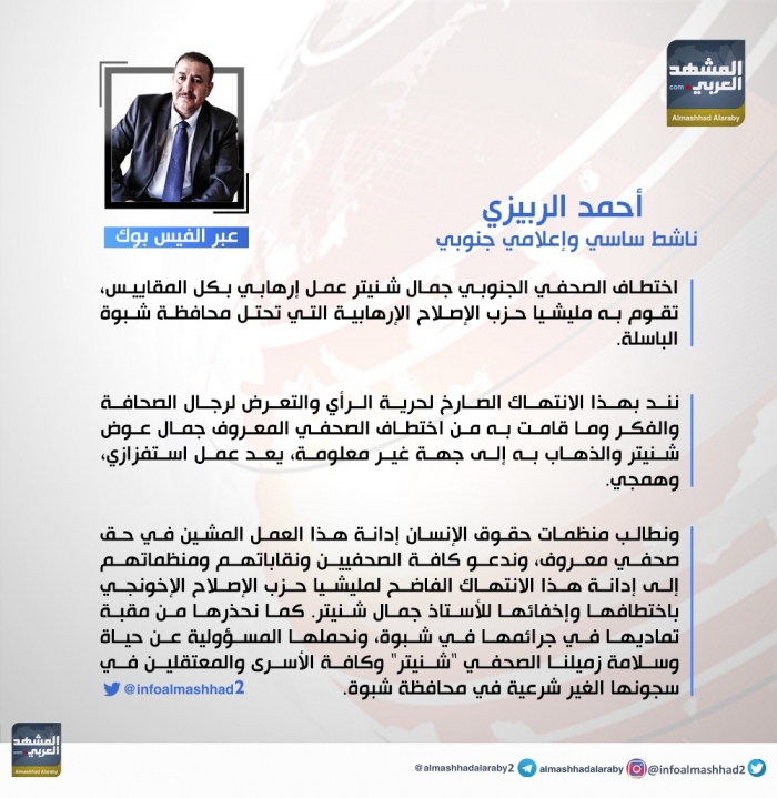 وكتب الربيزي، في تغريدة له على موقع التواصل الاجتماعي، فيس، تابعها المشهد العربي: "اختطاف الصحفي الجنوبي جمال شنيتر عمل إرهابي بكل المقاييس، تقوم به مليشيا حزب الإصلاح الإرهابية التي تحتل محافظة شبوة الباسلة".