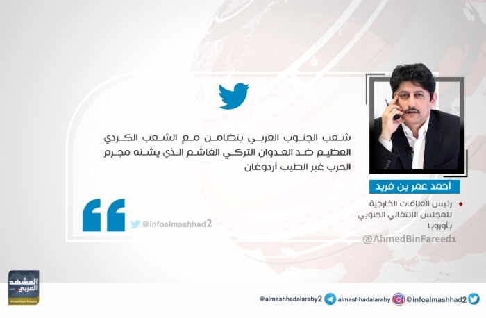 وكتب "بن فريد" في تغريدة عبر حسابه بتويتر، رصدها "المشهد العربي": "شعب الجنوب العربي يتضامن مع الشعب الكردي العظيم ضد العدوان التركي الغاشم الذي يشنه مجرم الحرب غير الطيب أردوغان"..