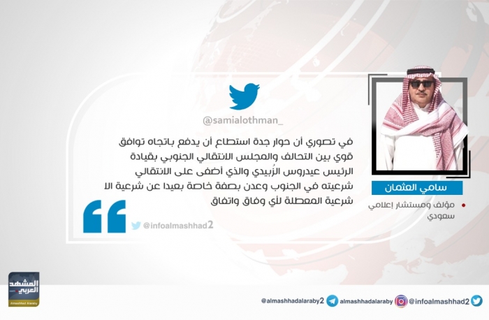 قال الكاتب السعودي سامي العثمان، اليوم، إن حوار جدة استطاع أن يدفع باتجاه توافق قوي بين التحالف والمجلس الانتقالي الحنوبي، مشددًا على أن الرئيس عيدروس الزُبيدي أضفى شرعية في الجنوب بعيدًا عن حكومة الشرعية المعطلة لأي وفاق أو اتفاق.