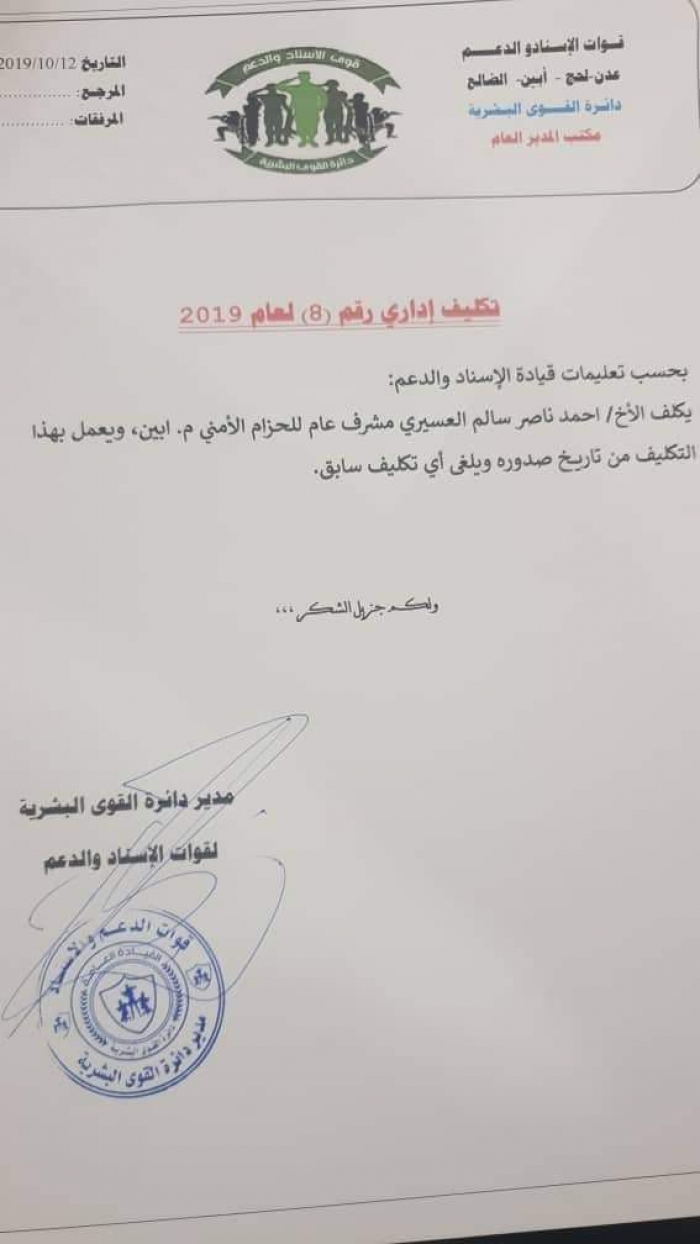 كلفت قيادة الإسناد والدعم، أحمد ناصر سالم العسيري مشرفاً عاماً للحزام الأمني في أبين.