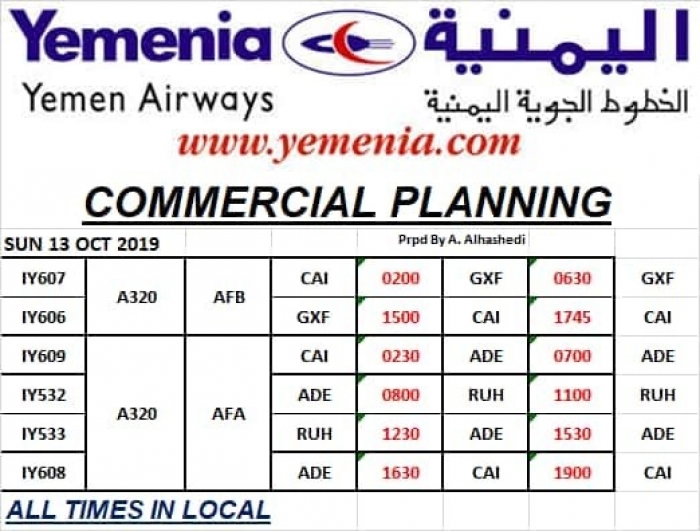 ينشر "المشهد العربي" مواعيد إقلاع رحلات طيران اليمنية غداً الأحد الموافق 13 أكتوبر 2019.