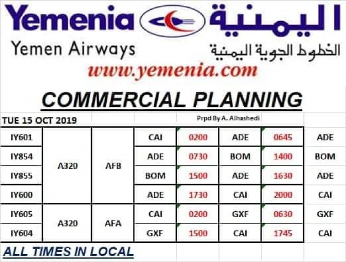 ينشر "المشهد العربي" مواعيد إقلاع رحلات طيران اليمنية غداً الثلاثاء الموافق 15 أكتوبر 2019.