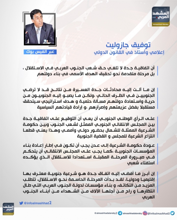 وتابع:"على الرأي الوطني الجنوبي أن يعي أن التوقيع على اتفاقية جدة بين المجلس الانتقالي الجنوبي الممثل لشعب الجنوب وبين حكومة الشرعية الممثلة للشمال بحضور دولي وأممي وهذا يعني قطعا انتزاع الشرعية للمجلس و القضية الجنوبية".