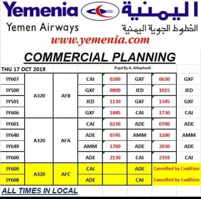 ينشر "المشهد العربي" مواعيد إقلاع رحلات طيران اليمنية غداً الخميس الموافق 17 أكتوبر 2019.