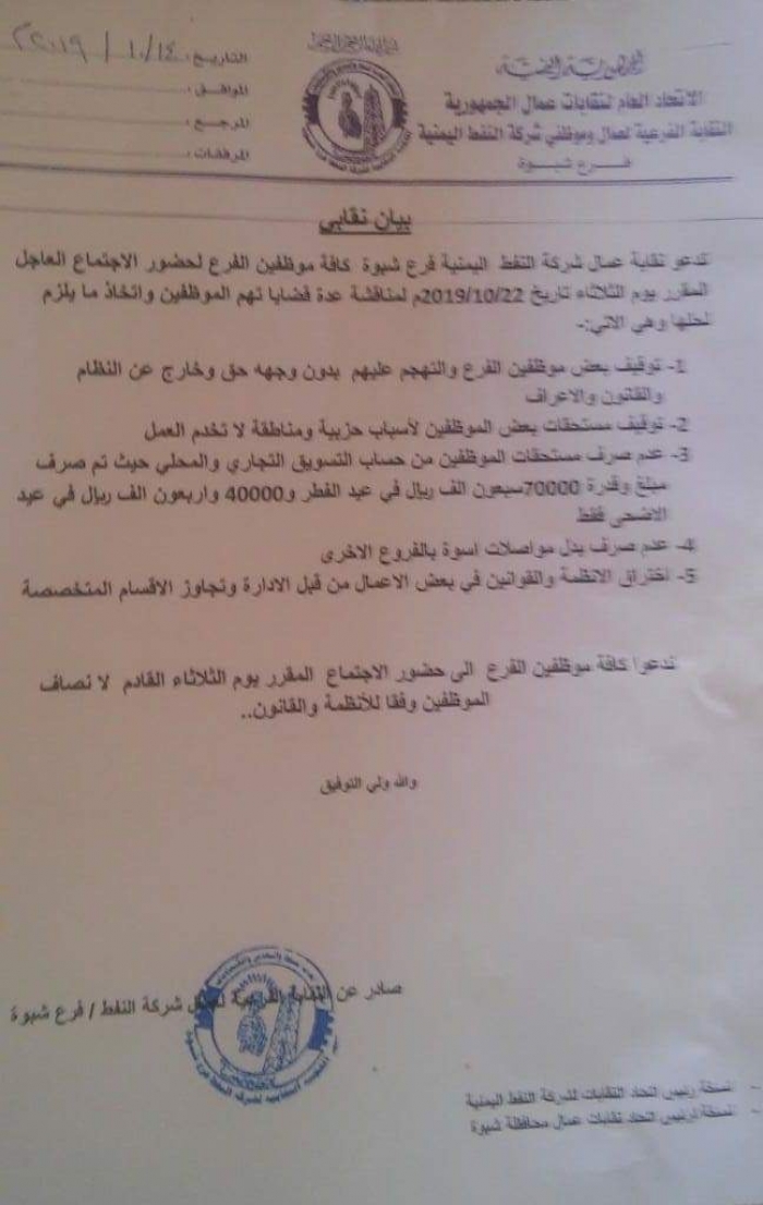 دعت نقابة عمال شركة النفط فرع شبوة، كافة موظفي الفرع لحضور الاجتماع المقرر له يوم الثلاثاء المقبل.