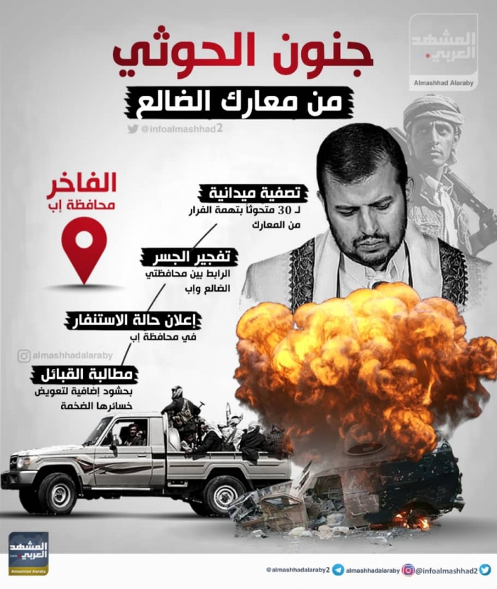 "الانفوجراف" التالي يرصد القرارات الجنونية التي اتخذتها مليشيا الحوثي بعد الهزيمة التي تلقتها من القوات الجنوبية في جبهات شمال الضالع من تحرير مدينة الفاخر الإستراتيجية والعديد من المناطق .