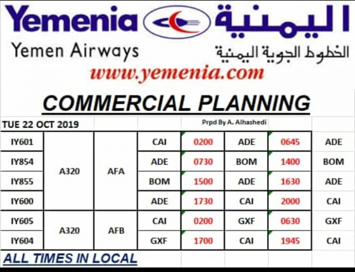 ينشر "المشهد العربي" مواعيد إقلاع رحلات طيران اليمنية غداً الثلاثاء الموافق 22 أكتوبر 2019.