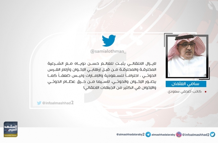 كتب العثمان، في تغريدة له على موقع التواصل الاجتماعي تويتر، تابعها المشهد العربي: "لايزال الانتقالي يثبت للعالم حسن نواياه مع الشرعية المخترقة والمحترقة من قبل إرهابي الإخوان وأزلام الفرس الحوثي، احترامًا للسعودية والإمارات وليس ضعفا كما يصور الإخوان والحوثي، لاسيما من حرق عظام الحوثي والإخوان في الكثير من الجبهات الانتقالي".
