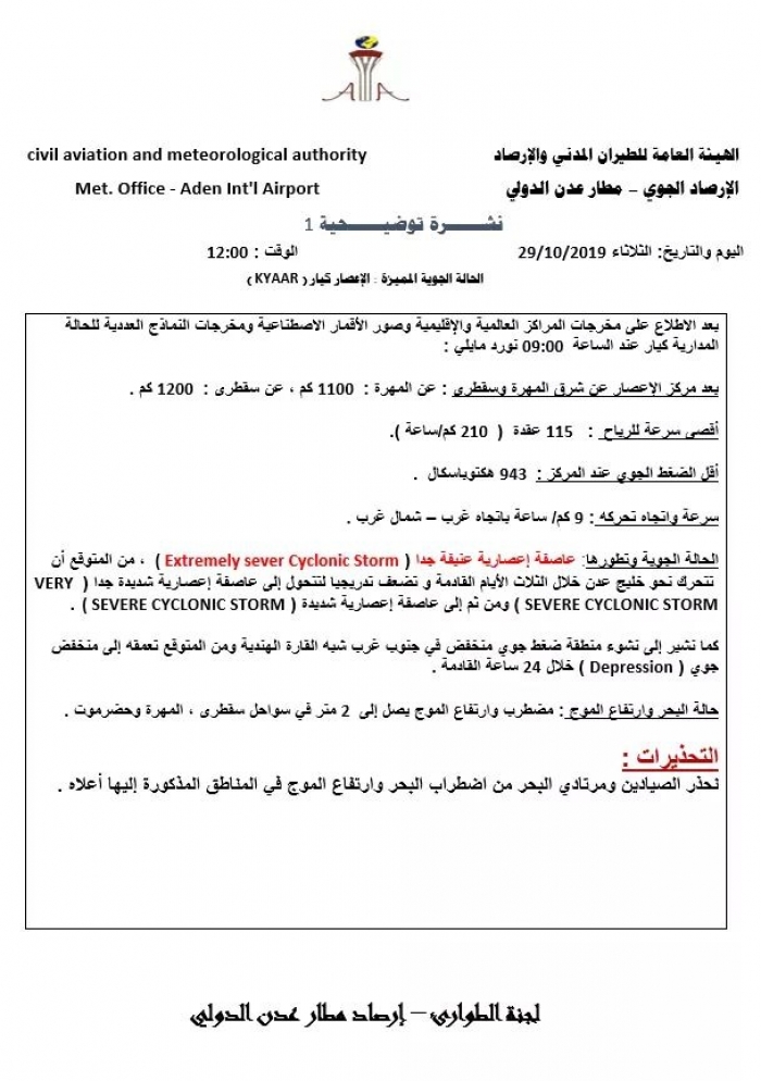 توقع مركز الأرصاد الجوي في مطار عدن الدولي، تحرك العاصفة الإعصارية المدارية "كيار" ناحية خليج عدن خلال الثلاثة أيام القادمة، على أن تضعف تدريجيا من عاصفة مدارية شديدة جدا إلى عاصفة مدارية شديدة.