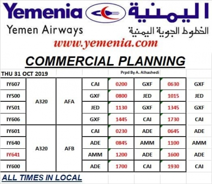 ينشر "المشهد العربي" مواعيد إقلاع رحلات طيران اليمنية غداً الخميس الموافق 31 أكتوبر 2019.
