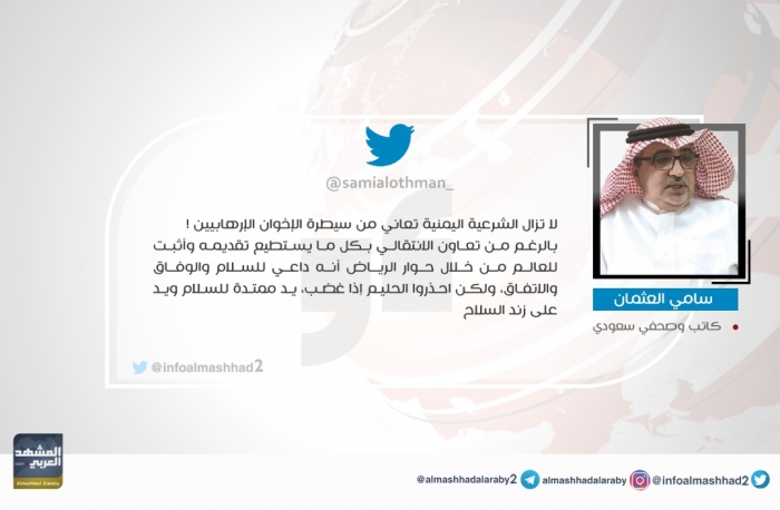 وجه الإعلامي السعودي سامي العثمان، اليوم، انتقادًا لاذعًا لحكومة الشرعية في اليمن، مؤكدًا أنها تُعاني من سيطرة الإخوان الإرهابيين، مشيرًا إلى أن المجلس الانتقالي الجنوبي أثبت للعالم من خلال حوار الرياض أنه داعي للسلام والوفاق والاتفاق.