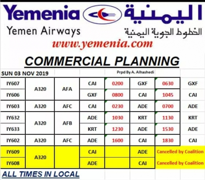 ينشر "المشهد العربي" مواعيد إقلاع رحلات طيران اليمنية غداً الأحد الموافق 3 نوفمبر 2019.