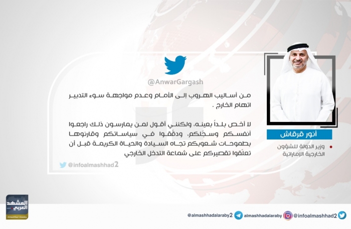 وقال قرقاش في تغريدة له على صفحته بموقع "تويتر" : "من أساليب الهروب إلى الأمام وعدم مواجهة سوء التدبير اتهام الخارج".