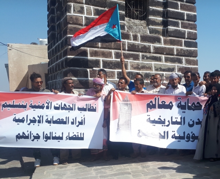 شارك المئات من أبناء العاصمة عدن، في وقفة احتجاجية، صباح اليوم الأحد، لإدانة محاولات الاعتداء المتكررة على حرم المعلم التاريخي "بيج بن" من عناصر مسلحة خارجة على القانون.
