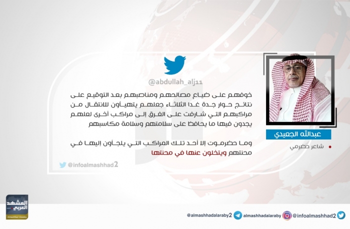 وكتب الجعيدي، في تغريدة له عبر موقع التواصل الاجتماعي تويتر، تابعها المشهد العربي: "خوفهم على ضياع مصالحهم ومناصبهم بعد التوقيع على نتائج حوار جدة غدا الثلاثاء جعلهم يتهيأون للانتقال من مراكبهم التي شارفت على الغرق إلى مراكب أخرى لعلهم يجدون فيها ما يحافظ على سلامتهم وسلامة مكاسبهم".