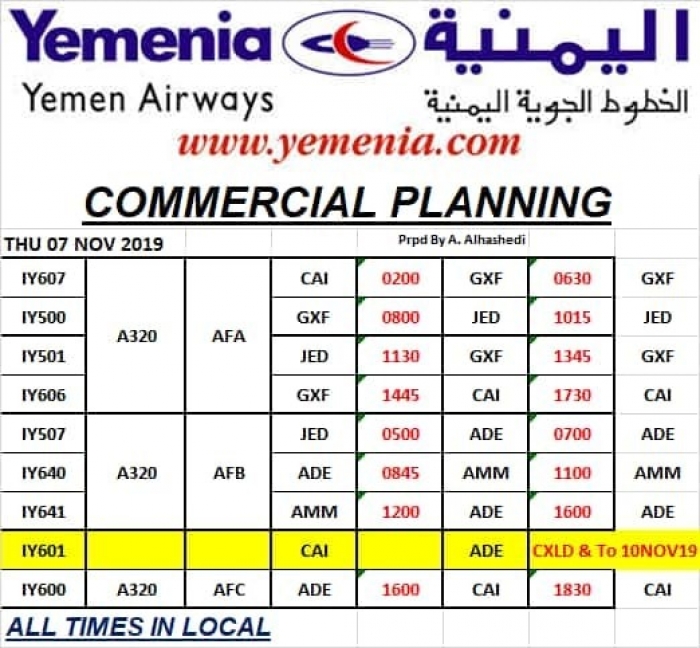مواعيد رحلات طيران اليمنية غداً الخميس 7 نوفمبر 2019