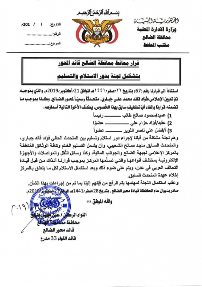 وأضاف القرار:" حيث كلف للجنة مكونة من التالية أسماؤهم في القيام بعملية الاستلام والتسليم وهم : العميد محمود صالح طالب رئيساً و العقيد فؤاد حزام علي عضوًا وفضل علي ناصر الثوير عضواً".