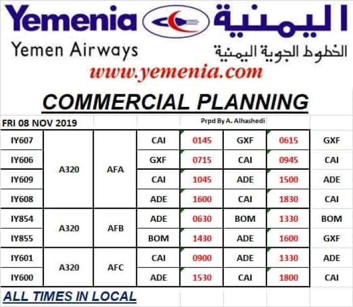 ينشر "المشهد العربي" مواعيد إقلاع رحلات طيران اليمنية غداً الجمعة الموافق 8 نوفمبر 2019.