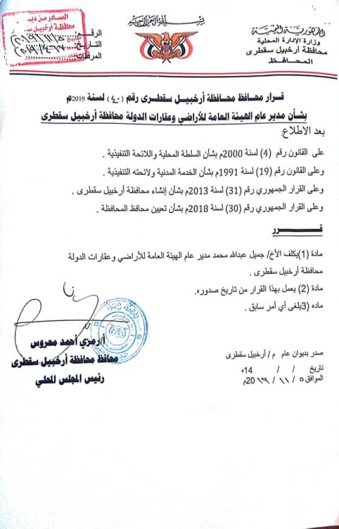 رمزي محروس يواصل عزل الكوادر المحلية بسقطرى ويعين تابعين له(وثيقة)