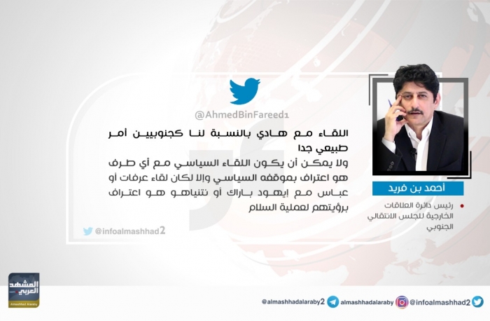 أكد رئيس دائرة العلاقات الخارجية للمجلس الانتقالي الجنوبي في أوروبا، أحمد عمر بن فريد،أن اللقاء مع الرئيس اليمني المؤقت عبدربه منصور هادي بالنسبة للجنوبيين أمر طبيعي جدا.