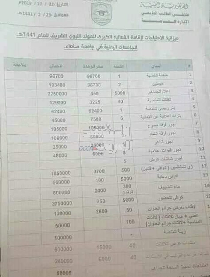 وقالت مصادر في جامعة صنعاء لـ"المشهد العربي" إن الجامعة أنفقت خمسة وستين مليون ريال على الحفل الخطابي الذي أقامته بإحدى قاعاتها.