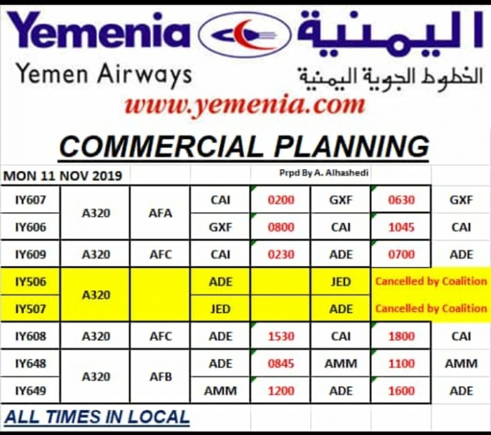 ينشر "المشهد العربي" مواعيد إقلاع رحلات طيران اليمنية غداً الإثنين الموافق 11 نوفمبر 2019.