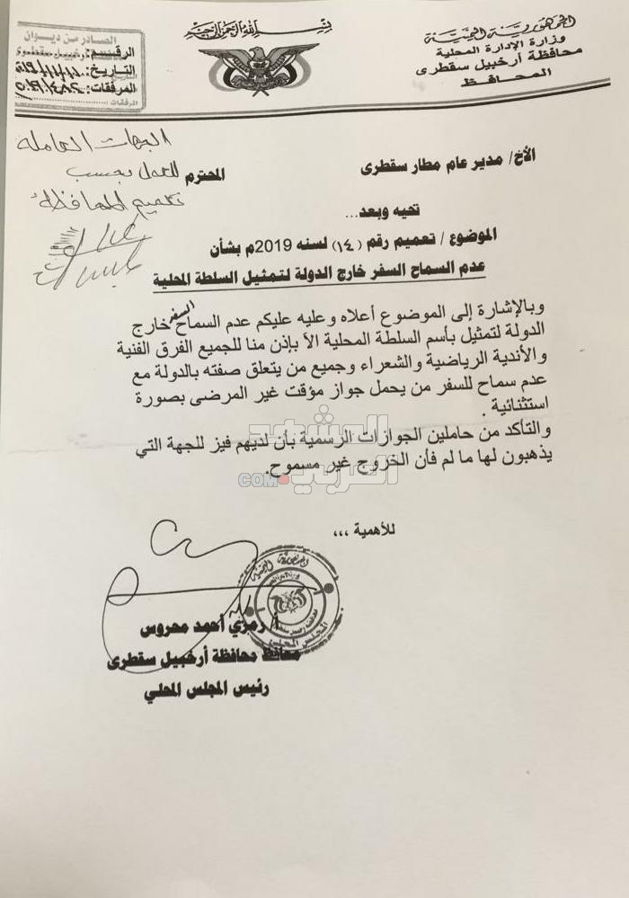 محافظ سقطرى الإخواني يضيق على المواطنين في السفر (وثيقة)