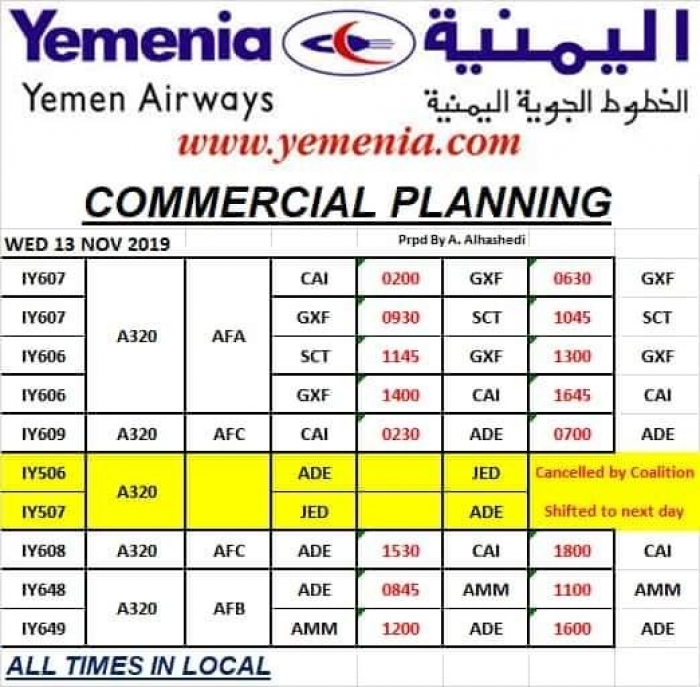 ينشر المشهد العربي، مواعيد رحلات طيران اليمنية، غدا الأربعاء، الموافق 13 نوفمبر 2019.