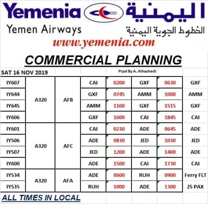 ينشر "المشهد العربي" مواعيد رحلات طيران اليمنية غداً السبت الموافق 16 نوفمبر 2019.