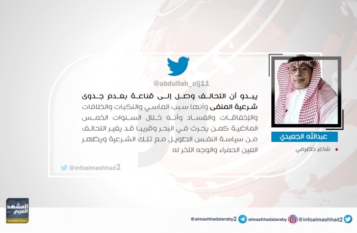 قال الشاعر عبدالله الجعيدي، اليوم، إن التحالف وصل إلى قناعة بعدم جدوى حكومة الشرعية وأنها سبب المآسي والنكبات والخلافات والإخفاقات والفساد.