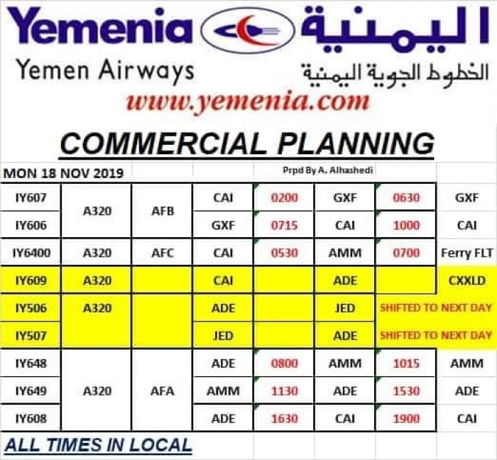 ينشر "المشهد العربي" مواعيد رحلات طيران اليمنية غداً الإثنين الموافق 18 نوفمبر 2019.