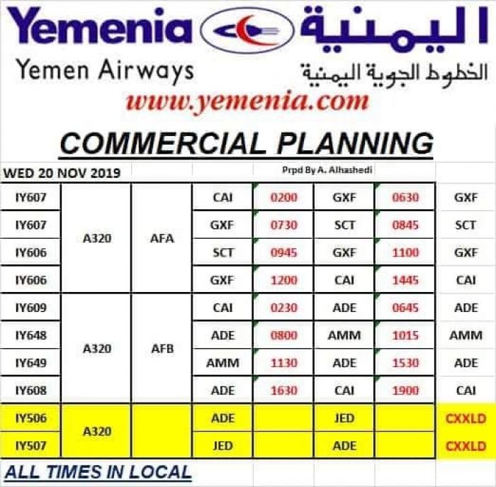 مواعيد رحلات طيران اليمنية غداً الأربعاء 20 نوفمبر 2019