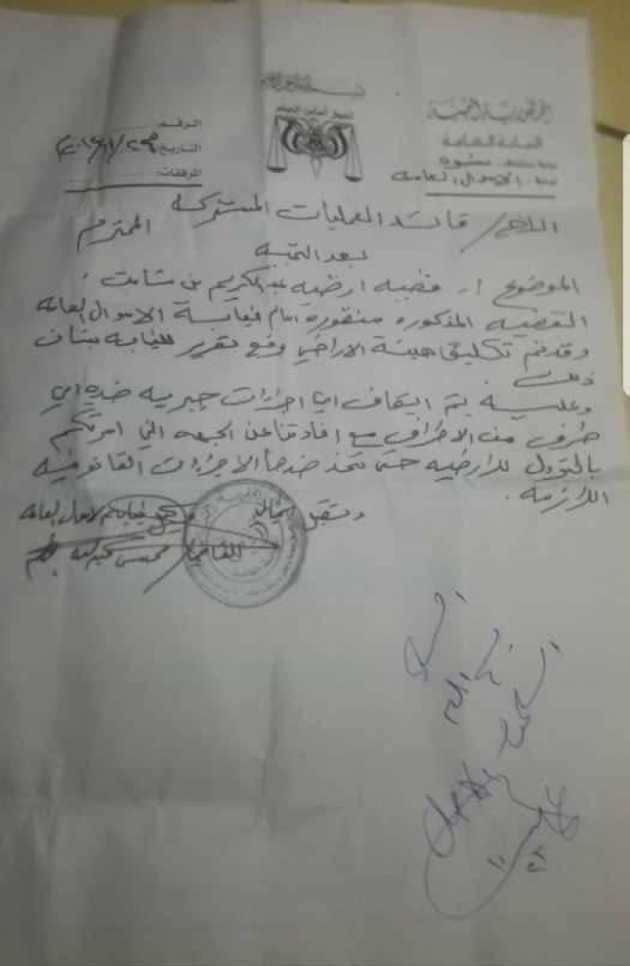 في فضيحة جديدة لقادة مليشيات الإخوان الإرهابية التابعة للشرعية، قامت نيابة الأموال العامة بمحافظة شبوة بتوجيه مذكرة لقائد ما يسمى القوات المشتركة الإخواني محمد سنيد ، تطالبه بوقف الإجراءات التي قامت بها قواته في الأرضية المتنازع عليها في حي 30 بمدينة عتق.