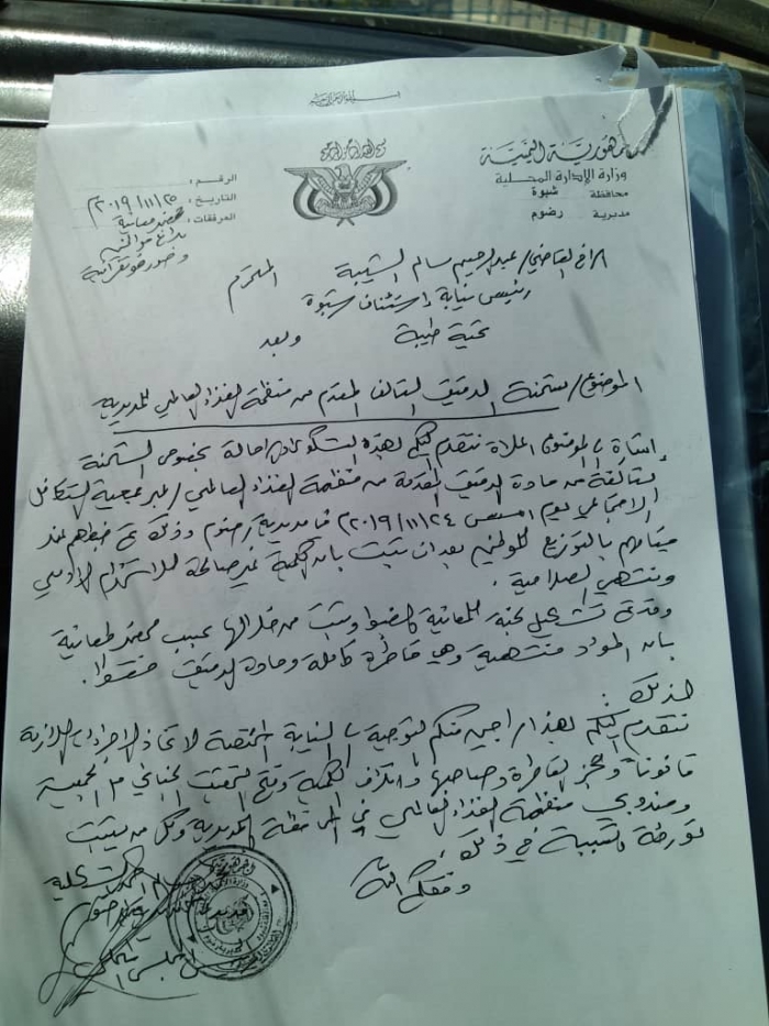 نيابة شبوة تتحفظ على مساعدات فاسدة لـ التكافل الإنساني (وثيقة)