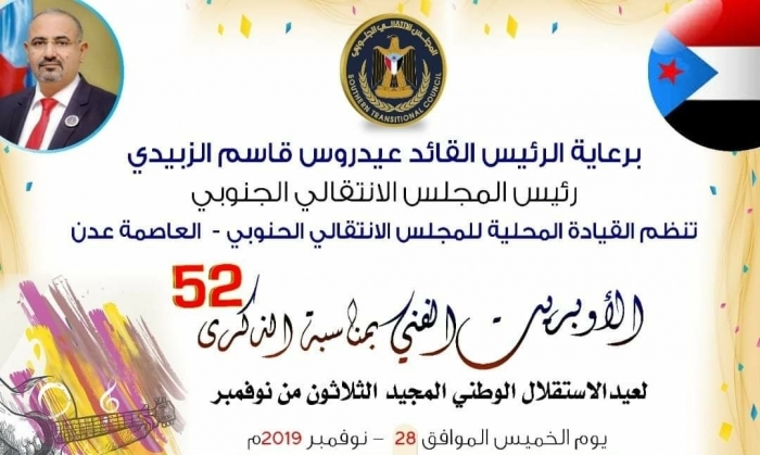 تقيم القيادة المحلية للمجلس الانتقالي بالعاصمة عدن مساء غدٍ الخميس في قاعة ليلتي بمديرية المعلا، أوبريت فني استعراضي بمناسبة الذكرى الـ 52 لعيد الاستقلال الوطني، وذلك برعاية الرئيس القائد عيدروس قاسم الزُبيدي.