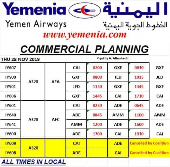 ينشر "المشهد العربي" مواعيد رحلات طيران اليمنية غداً الخميس، الموافق 28 نوفمبر 2019.