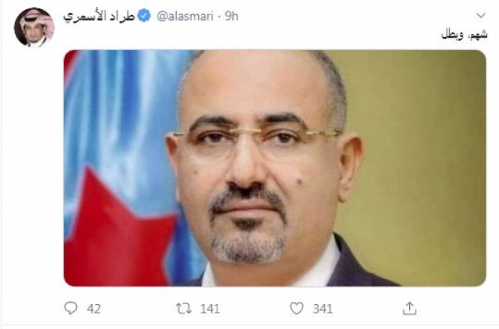 نشر الإعلامي السعودي طراد الأسمري، اليوم، صورة لرئيس المجلس الانتقالي الجنوبي الرئيس عيدروس الزُبيدي وعلق عليها قائلاً: "شهم وبطل".