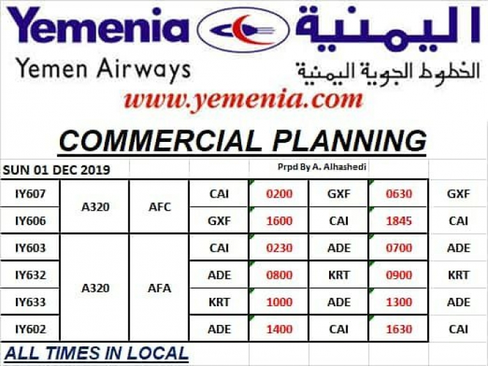 ينشر المشهد العربي، رحلات طيران اليمنية، غدا الأحد، الموافق 1 ديسمبر 2019.
