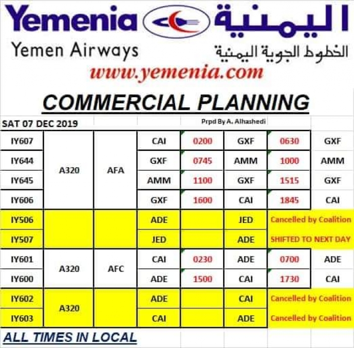 أعلنت طيران اليمنية، تسيير 6 رحلات جوية، غدا السبت الموافق 7 ديسمبر، إلى القاهرة وعدن وسيئون وعمان.