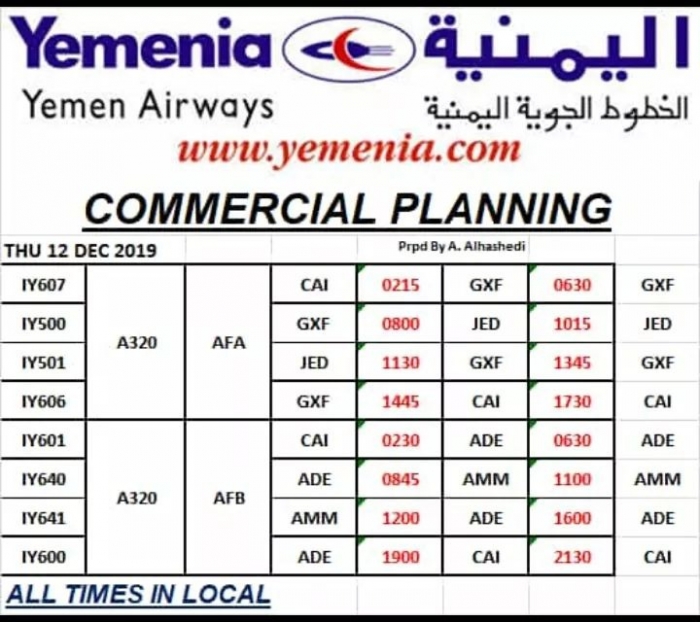 ينشر "المشهد العربي" مواعيد رحلات طيران اليمنية غداً الخميس، الموافق 12 ديسمبر 2019.