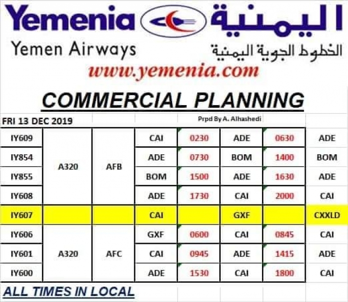 ينشر "المشهد العربي" مواعيد رحلات طيران اليمنية غداً الجمعة، الموافق 13 ديسمبر 2019.