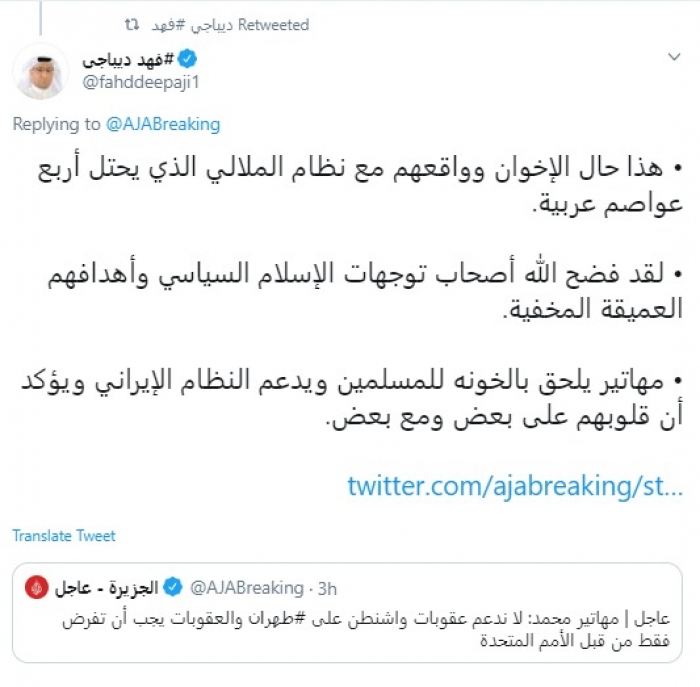 وأضاف: "لقد فضح الله أصحاب توجهات الإسلام السياسي وأهدافهم العميقة المخفية. مهاتير يلحق بالخونة للمسلمين ويدعم النظام الإيراني ويؤكد أن قلوبهم على بعض ومع بعض".