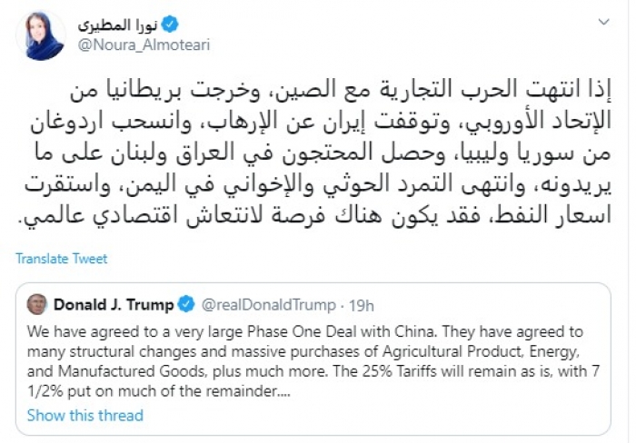 وقالت في تغريدة عبر "تويتر" رصدها "المشهد العربي": "إذا انتهت الحرب التجارية مع الصين، وخرجت بريطانيا من الاتحاد الأوروبي، وتوقفت إيران عن الإرهاب، وانسحب أردوغان من سوريا وليبيا، وحصل المحتجون في العراق ولبنان على ما يريدونه، وانتهى التمرد الحوثي والإخواني في اليمن، واستقرت أسعار النفط، فقد يكون هناك فرصة لانتعاش اقتصادي عالمي".