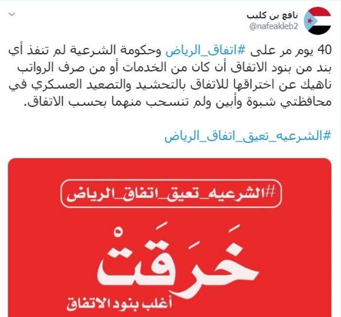وكتب "بن كليب" في تغريدة عبر حسابه الشخصي بتويتر، رصدها "المشهد العربي" قال فيها: "40 يوم مر على #اتفاق _ الرياض وحكومة الشرعية لم تنفذ أي بند من بنود الاتفاق إن كان من الخدمات أو من صرف الرواتب".