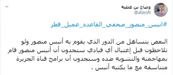 واختتم "بن عطية " تغريدته بهاشتاج #انيس _ منصور _ صحفي _ القاعده _ عميل _ قطر.