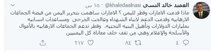 وتساءل النسي عبر "تويتر":"ماذا قدمت الإمارات وقطر لليمن ؟ الإمارات ساهمت بتحرير اليمن من قبضة الجماعات الإرهابية وقدمت الدعم لأبناء الشهداء وعالجت الجرحى ومساعدات إنسانية بمليارات الدولارات وتأهيل البنية التحتية".