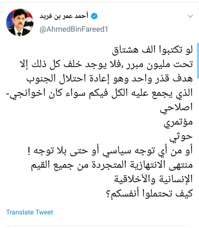 وكتب بن فريد، في تغريدة له عبر موقع التواصل الاجتماعي تويتر، تابعها المشهد العربي: "لو تكتبوا ألف هشتاق تحت مليون مبرر، فلا يوجد خلف كل ذلك إلا هدف قذر واحد وهو إعادة احتلال الجنوب الذي يجمع عليه الكل فيكم سواء كان إخوانجي إصلاحي مؤتمري حوثي، أو من أي توجه سياسي أو حتى بلا توجه".